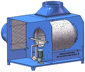 含固體物質(zhì)的空氣從圖中進(jìn)風(fēng)口流進(jìn)過(guò)濾裝置,所有的氣體沿旋轉(zhuǎn)桶徑向流過(guò)過(guò)濾網(wǎng),然后沿旋轉(zhuǎn)桶軸向流出過(guò)濾桶,最后從圖中出風(fēng)口排出過(guò)濾設(shè)備。