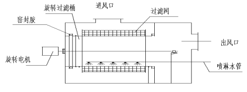 本裝置中旋轉(zhuǎn)式、帶自動(dòng)清洗的空氣過(guò)濾器結(jié)構(gòu)原理如下:。